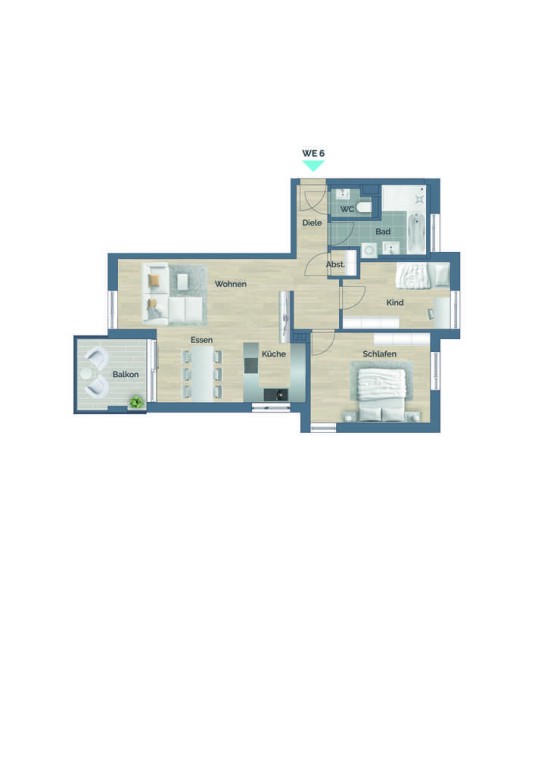 Die offene Küche ist modern gestaltet. Der angrenzende Essbereich lädt zu geselligen Mahlzeiten ein und bietet ausreichend Platz für Ihre Familie und Gäste. Zudem verfügt die Wohnung über zwei gemütliche Schlafzimmer, die individuell genutzt werden können, sowie ein stilvolles Badezimmer mit einer großzügigen, begehbaren Dusche und hochwertigen Sanitäranlagen. Ein zusätzliches separates WC sowie ein praktischer Abstellraum innerhalb der Wohnung bieten Ihnen weiteren Komfort und Stauraum für Haushaltsgegenstände.