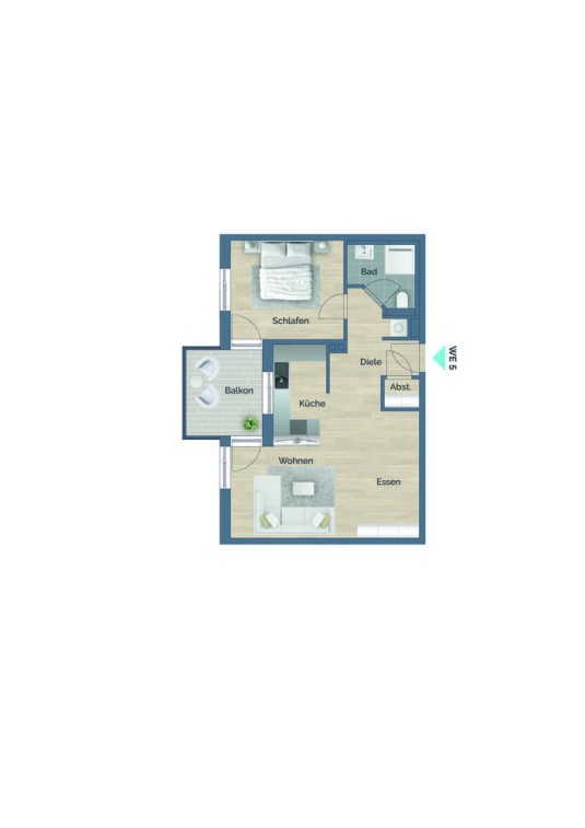 Die offene Küche ist modern gestaltet. Der angrenzende Essbereich lädt zu geselligen Mahlzeiten ein und bietet ausreichend Platz für Ihre Familie und Gäste. Zudem verfügt die Wohnung über ein gemütliche Schlafzimmer, sowie ein stilvolles Badezimmer mit einer großzügigen, begehbaren Dusche und hochwertigen Sanitäranlagen. Ein praktischer Abstellraum innerhalb der Wohnung bieten Ihnen weiteren Komfort und Stauraum für Haushaltsgegenstände.