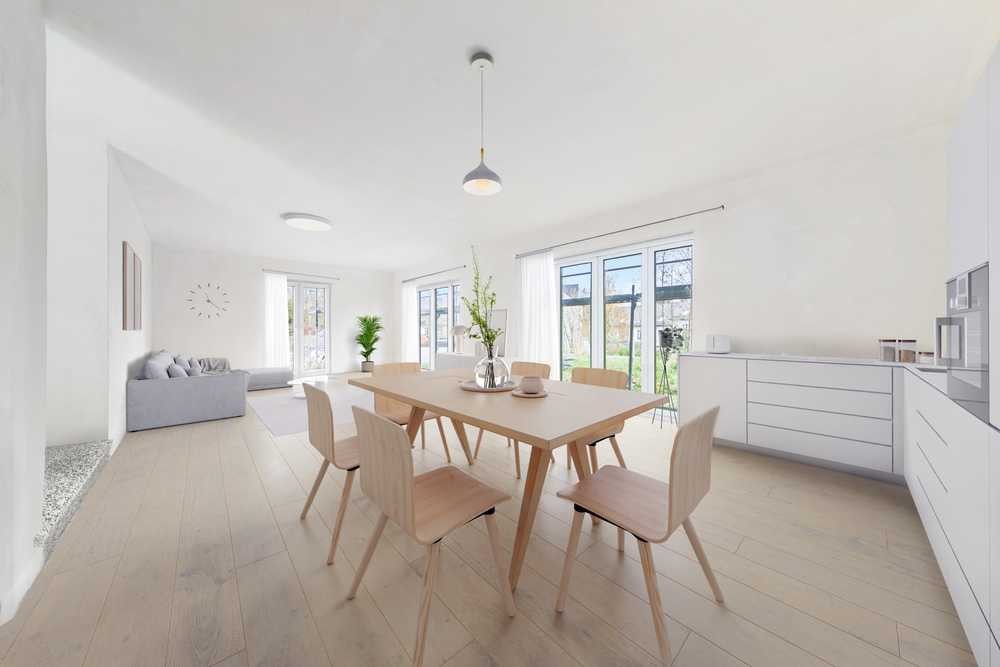 - Ein offener Küchen-/Ess-/Wohnbereich mit direktem Zugang zur Sonnenterrasse und dem eigenen Garten
