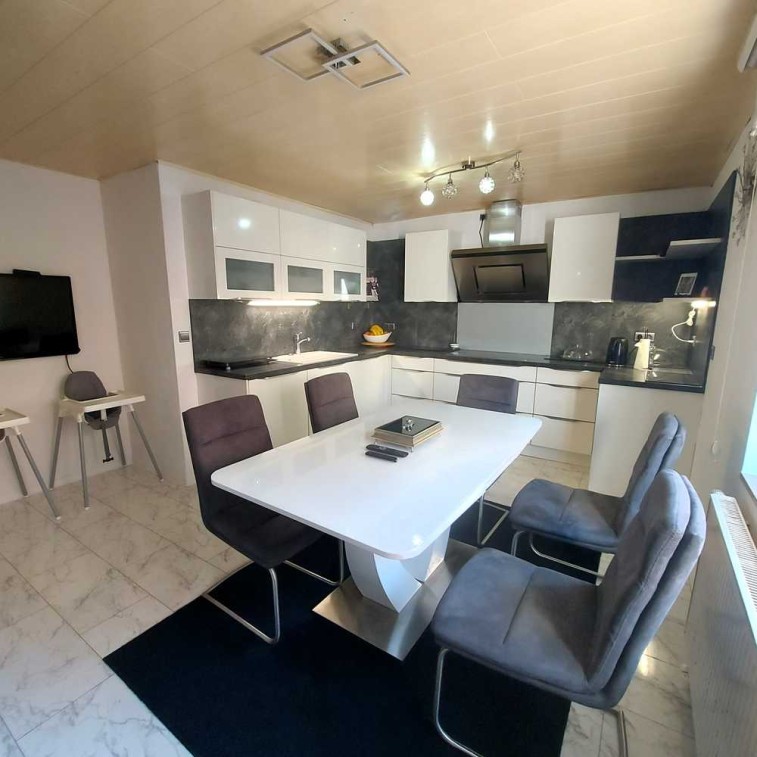 Das Wohn-/Esszimmer bietet Platz für eine große Wohnwand mit Sofa und einen großen Esstisch. Ein Kachelofen (mit neuem Einsatz) sorgt für die wohlige Wärme im Raum und wird vom Flur beheizt. Die moderne Küche neben dem Wohnzimmer lässt für den Kochliebhaber keine Wünsche offen. Sie bietet viel Stauraum und Arbeitsfläche und ist mit namhaften Elektrogeräten ausgestattet. In der Küche ist auch noch Platz für einen großen Esstisch.