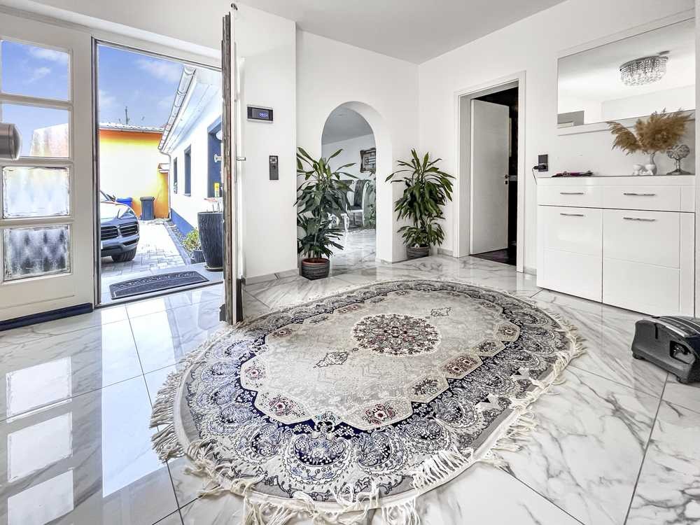 Da es sich hier um einen Bungalow handelt, profitiert man von großzügigen, ebenerdigen Flächen, welche einfach zu erreichen sind und durch einen Steinboden in Marmoroptik, ein exklusives Gefühl vom Eingangsbereich, bis hin zur Teil-Unterkellerung vermitteln. Durch die L-förmige Bauweise strahlt die Sonne ab 15:00 Uhr erst in das Esszimmer und wandert über den Eingangsbereich bis hin zu den Schlafzimmern und dem im Außenbereich neu gestalteten Podest, weshalb jedes Zimmer über den Tagesverlauf natürlich und angenehm beleuchtet wird.