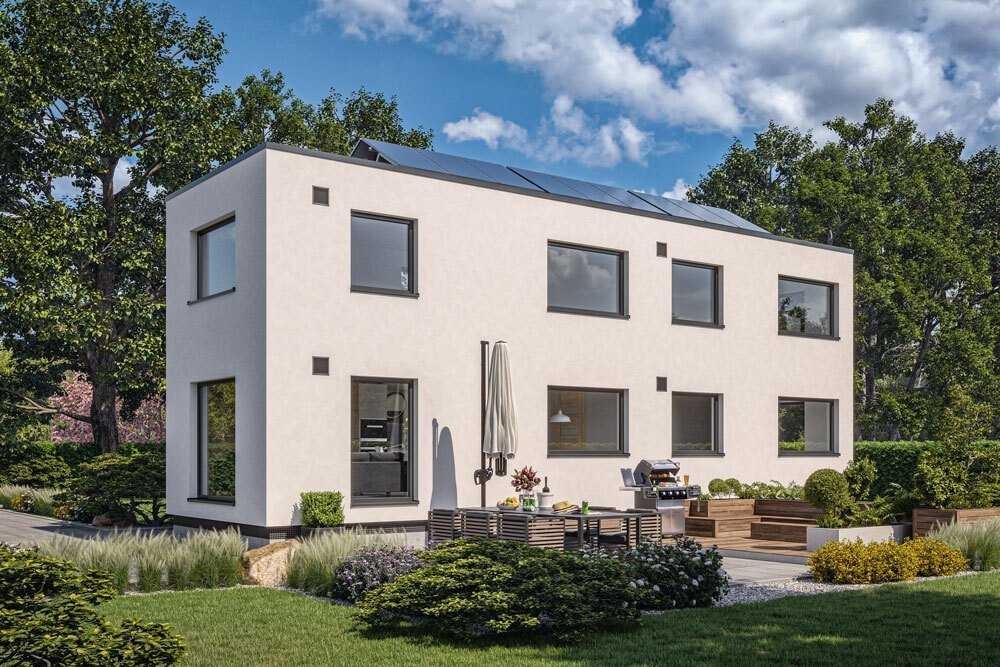 Entdecken Sie den zweigeschossigen Entwurf C-102 mit seinem modernen Design und einer Wohneinheit auf jeder Etage. Individueller Nutzen und Flexibilität dieses Entwurfs stehen hierbei im Mittelpunkt. Jede Wohneinheit verfügt über einen eigenen Zugang, der Privatsphäre garantiert. Großflächige und teilweise bodentiefe Fenster sorgen für ein lichtdurchflutetes und einladendes Wohngefühl. Leben Sie modernes Wohnen in einem nachhaltigen Modulhaus kombiniert mit PV-Anlage auf dem Flachdach.