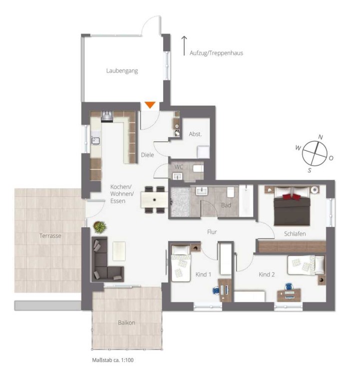 Der Zugang zu den Wohnungen erfolgt größtenteils über einen Laubengang mit geschützten, persönlichen Wohnungseingangsbereichen. Natürlich sind alle Etagen über den Personenaufzug erreichbar.