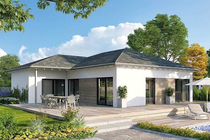 Der Koch-, Wohn- und Essbereich ist offen gestaltet und verfügt über eine freistehende Wand zwischen Küche und Wohnzimmer, die dem Raum zusätzliche Struktur gibt. Zwischen den bodentiefen Fenstern des Bungalows befinden sich natürliche Holzelemente, die Chello 116 im Zusammenspiel mit dem harmonischen Walmdach einen besonderen Charme verleihen. Die Terrasse profitiert von einem großzügigen Dachüberstand, der Schutz bei Wind und Regen bietet.