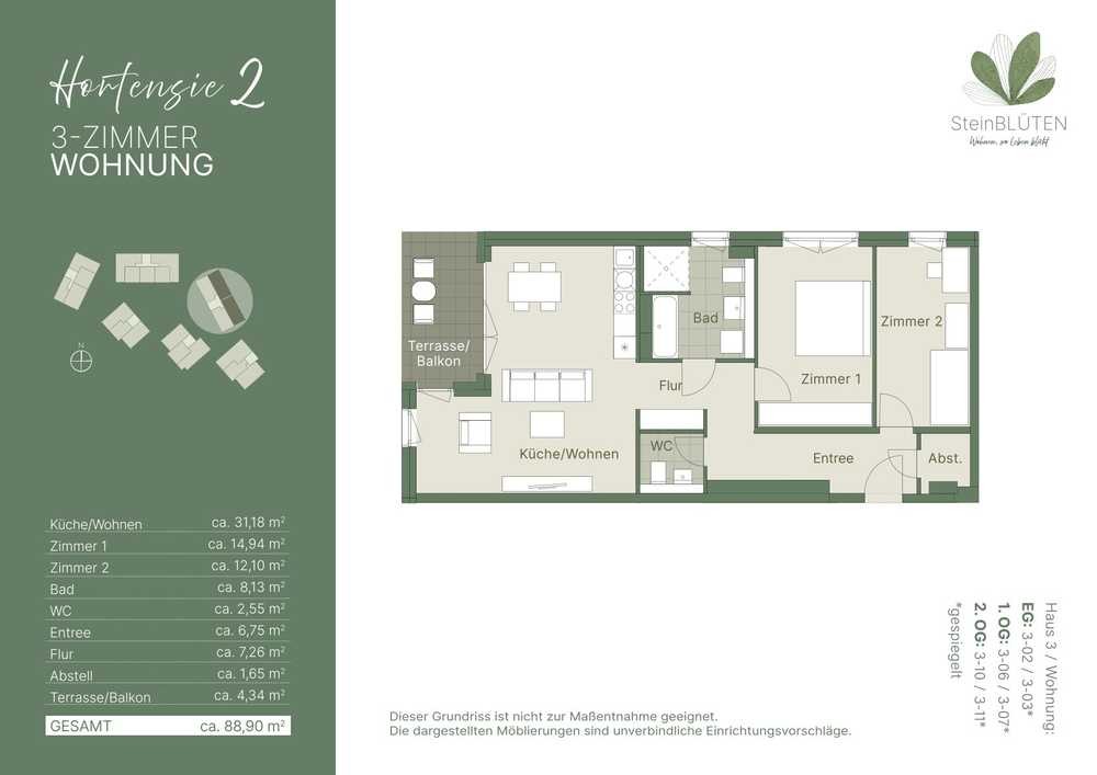 Die SteinBLÜTEN in der Deutenbacher Straße 3 in Stein, stehen für modernes Wohnen direkt am Landschaftsschutzgebiet. Sechs Wohnhäuser, die die Namen Magnolie, Lavendel, Hortensie, Hibiskus, Flieder und Jasmin tragen, bieten insgesamt 80 Eigentumswohnungen in einer einzigartigen Lage. Die Architektur wurde sorgfältig entwickelt, um das Leben der Bewohner zum Blühen zu bringen. Mit Wohnflächen zwischen 49,50 und 134,6 Quadratmetern und Wohnungen mit zwei, drei oder vier Zimmern gibt es für jede Lebenssituation den passenden Wohn(t)raum. Egal ob Sie als Paar, Familie oder Single ein neues Zuhause suchen, die Vielfalt der SteinBLÜTEN hält garantiert die passende Wohnung für Sie bereit. Sie wohnen hier inmitten der Natur, mit einem atemberaubenden Blick auf den Rednitzgrund. Die moderne Architektur fügt sich harmonisch in die Umgebung ein und verbindet zeitgemäßes Wohnen mit der Schönheit der Natur. Dank barrierefreier Zugänge genießen Sie höchsten Komfort, unabhängig von Ihrer Lebensphase.
