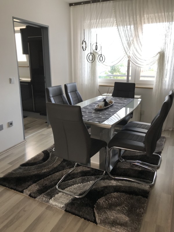 Der Wohn-/Essbereich bildet den Mittelpunkt der Wohnung. Großzügige Fensterelemente lassen viel Helligkeit und Luft herein und sorgen in Kombination mit dem Laminatboden für Wohlfühlatmosphäre.