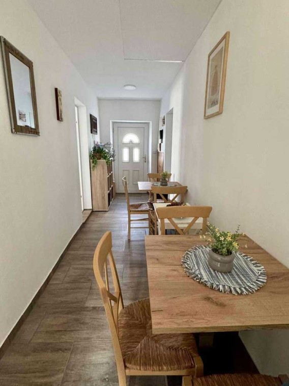 Zum Verkauf steht eine in den letzten 4 Jahren liebevoll sanierte Pension mit Wohnung (oder Ferienwohnung). Es handelt sich um ein Gebäude mit 2 Etagen, Hintergebäude mit 2 Etagen und Nebengebäuden (Keller, Abstellraum, Heizungsraum). Im vorderen Gebäude wurde das Erdgeschoss bereits liebevoll saniert und es entstanden 4 Pensionszimmer mit jeweils eigenem Bad mit Dusche und eine gemeinschaftliche Küche für die Pensionsgäste. Es handelt sich um 2 Einzelzimmer und 2 Doppelzimmer. Im Obergeschoss wurde der Grundstein zur Sanierung bereits gelegt (neue Holzbalken) und es gibt eine Baugenehmigung für eine Wohnung mit Balkon. Der Zugang erfolgt nach Beplanung vom Flur. Im Erdgeschoss des hinteren Gebäudes liegt eine 2-Zimmerwohnung mit mit separaten Garten. Auch diese Wohnung ist bereits liebevoll saniert und auch hier gibt es bereits eine Baugenehmigung zum Ausbau des Obergeschoss. Der Zugang erfolgt über die bereits vorhandene Treppe im Hof. Der Hof bietet außerdem Platz zum Abstellen von bis zu 2 Fahrzeugen, es gibt eine gemütliche Sitzecke (für Pensionsgäste vorgesehen) und man erreicht Abstellräume und den Heizungsraum. Alle Räumlichkeiten werden über die vorhandene zentrale Ölheizung beheizt.