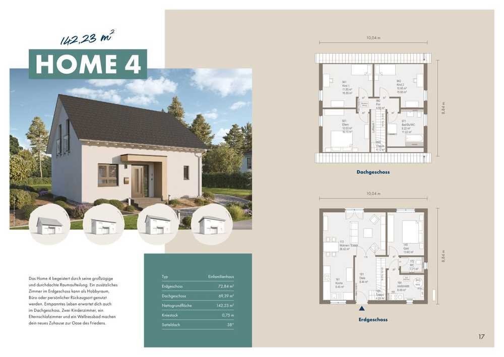 Das Home 4 begeistert durch seine großzügige und durchdachte Raumaufteilung. Ein zusätzliches Zimmer im Erdgeschoss kann als Hobbyraum, Büro oder persönlicher Rückzugsort genutzt werden. Entspanntes Leben erwartet dich auch im Dachgeschoss. Zwei Kinderzimmer, ein Elternschlafzimmer und ein Wellnessbad machen dein neues Zuhause zur Oase des Friedens.