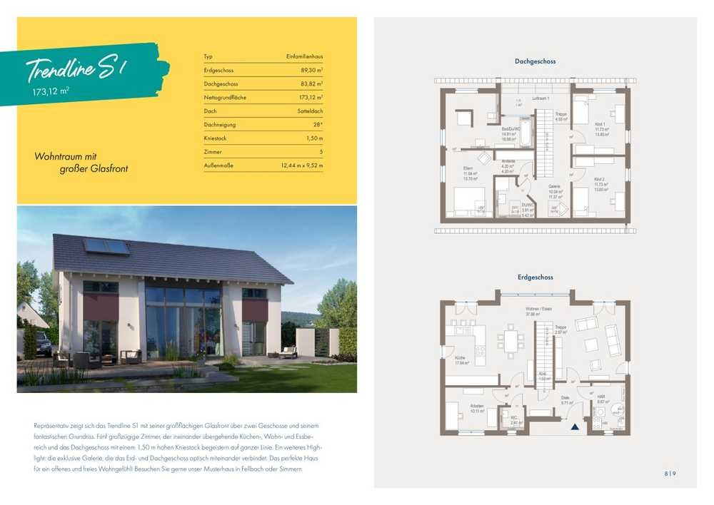 Repräsentativ zeigt sich Trendline S 1 mit einer phantastischen Raumaufteilung durch großzügige Zimmer, mit dem offenen, ineinander übergehenden Wohn-, Ess- und Küchenbereich. Anspruchsvoll stellt sich das Dachgeschoss dar, welches mit einem hohen Kniestock ausgestattet ist. Für eine helle, freundliche Atmosphäre sorgen die bodentiefen Fenster und die zusätzliche, großflächige Glasfront über zwei Geschosse. Ein weiteres erfreuliches Extra: die optische Verbindung der beiden Wohnebenen über eine exklusive Galerie.