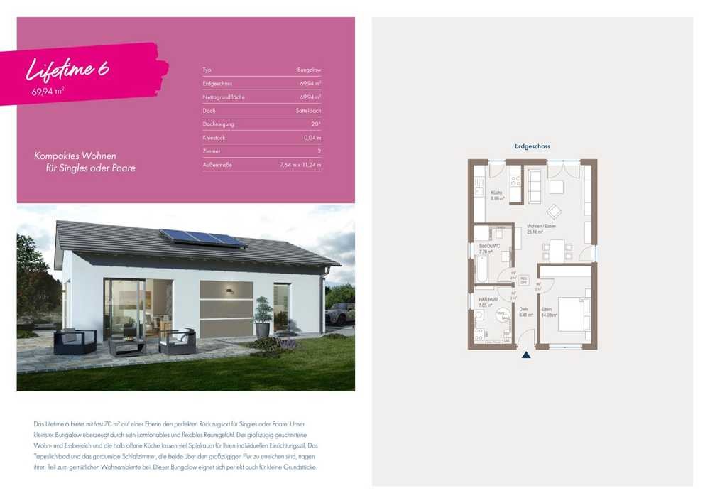 Das Lifetime 6 bietet mit fast 70 m² auf einer Ebene den perfekten Rückzugsort für Singles oder Paare. Unser kleinste Bungalow überzeugt durch sein komfortables und flexibles Raumgefühl. Der großzügig geschnittene Wohn- und Essbereich und die halb offene Küche lassen viel Spielraum für Ihren individuellen Einrichtungsstil. Das Tageslichtbad und das geräumige Schlafzimmer, die beide über den großzügigen Flur zu erreichen sind, tragen ihren Teil zum gemütlichen Wohnambiente bei. Dieser Bungalow eignet sich perfekt auch für kleine Grundstücke.