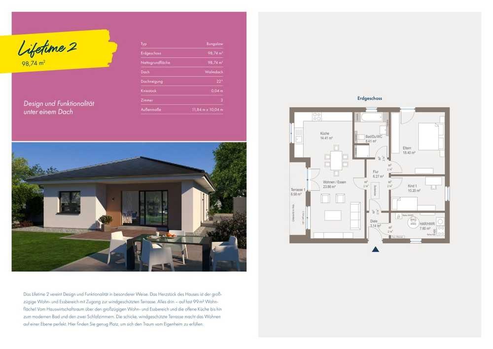 In moderner und attraktiver Bungalowbauweise präsentiert sich unser Haus Lifetime 2 mit einer windgeschützten Terrasse. Das durchdachte Baukonzept ermöglicht nicht nur Ehepaaren oder jungen Familien den Ausstieg aus der Miete. Herzstück des Hauses ist der großzügige Wohnraum mit Zugang zur Terrasse. Von der geräumigen Essküche bis zum Kinder-/Arbeitszimmer bietet das Lifetime 2 alles was das Herz begehrt.