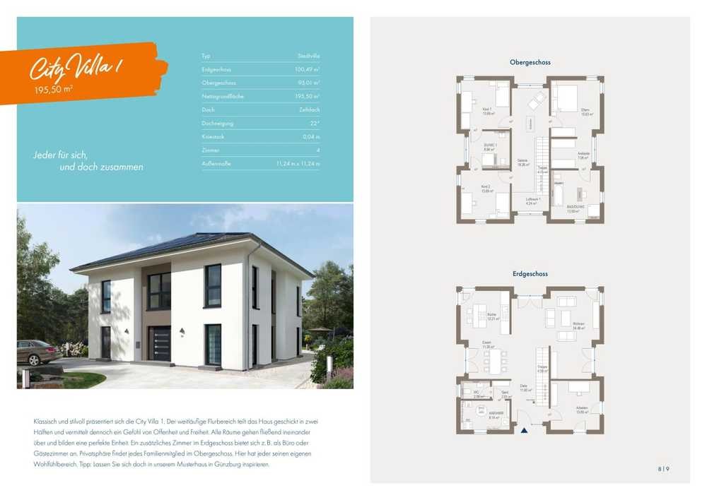 Klassisch und stilvoll präsentiert sich die City Villa 1. Der große Wohn-/Essbereich bietet viel Platz für gemütliche Stunden mit der ganzen Familie. Privatsphäre findet jedes Familienmitglied im Obergeschoss, hier gibt es zwei gleichgroße Kinderzimmer sowie ein Elternschlafzimmer inklusive begehbarem Ankleide¬zimmer und separatem Badezimmer, welches nur von hier erreichbar ist. Dank einem zweiten Bad im Obergeschoss, gehört der morgendliche Streit um das Badezimmer der Vergangenheit an.