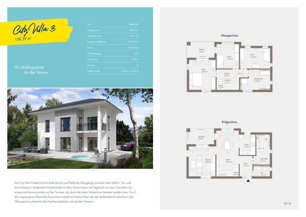 Die City Villa 3 besticht durch helle Räume und fließende Übergänge zwischen dem Wohn-, Ess- und Küchenbereich. Bodentiefe Fensterfronten an allen Seiten lassen viel Tageslicht ins Haus. Genießen Sie entspannte Sonnenstunden auf der Terrasse, die durch die vielen Fenstertüren betreten werden kann. Durch die vorgezogene Wand des Esszimmers entsteht ein kleiner Erker, der den Außenbereich abschirmt. Das Obergeschoss biete für alle Familienmitglieder individuellen Freiraum.
