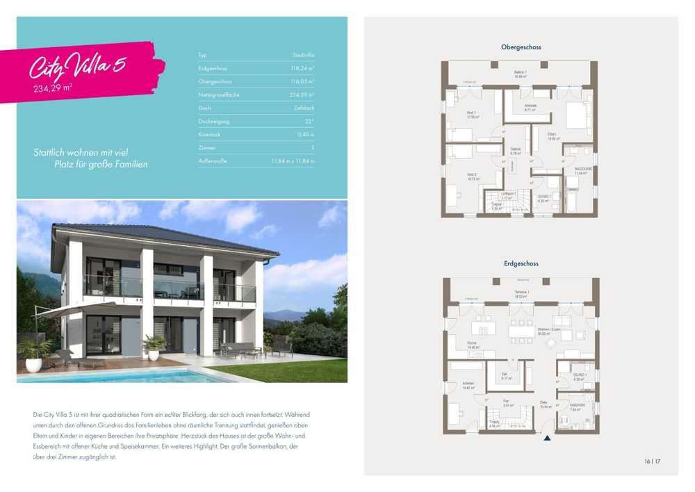 Die City Villa 5 ist mit ihrer quadratischen Form ein echter Blickfang, der sich auch ihnen fortsetzt: Während unten durch den offenen Grundriss das Familienleben ohne räumliche Trennung stattfindet, genießen oben Eltern und Kinder in eigenen Bereichen ihre Privatsphäre. Herzstück des Hauses ist der große Wohn- und Essbereich mit offener Küche und Speisekammer. Ein weiteres Highlight: Der große Sonnenbalkon, der über drei Zimmer zugänglich ist.