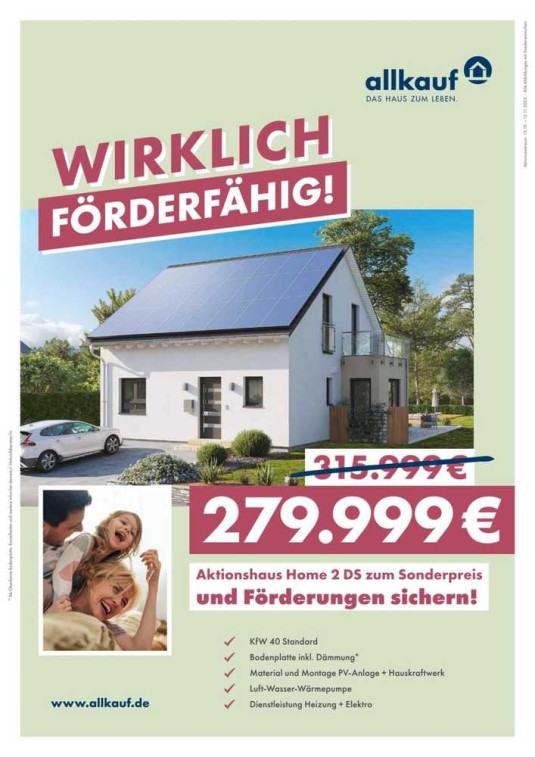 Dieses Aktionshaus Home 2 DS entspricht den hohen Anforderungen an Energieeffizienz und Nachhaltigkeit. Dadurch hast du einen Anspruch auf die zinsverbilligten Darlehen aus KFN - Förderung und der Förderung Wohneigentum für Familien .