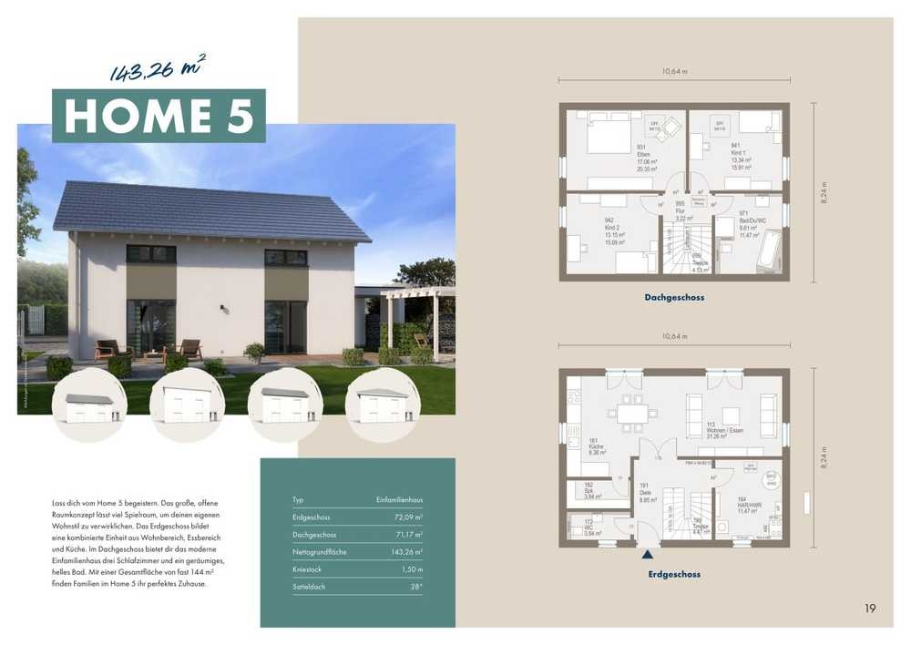 Lass dich vom Home 5 begeistern. Das große, offene Raumkonzept lässt viel Spielraum, um deinen eigenen Wohnstil zu verwirklichen. Das Erdgeschoss bildet eine kombinierte Einheit aus Wohnbereich, Essbereich und Küche. Im Dachgeschoss bietet dir das moderne Einfamilienhaus drei Schlafzimmer und ein geräumiges, helles Bad. Mit einer Gesamtfläche von fast 144 m² finden Familien im Home 5 ihr perfektes Zuhause.