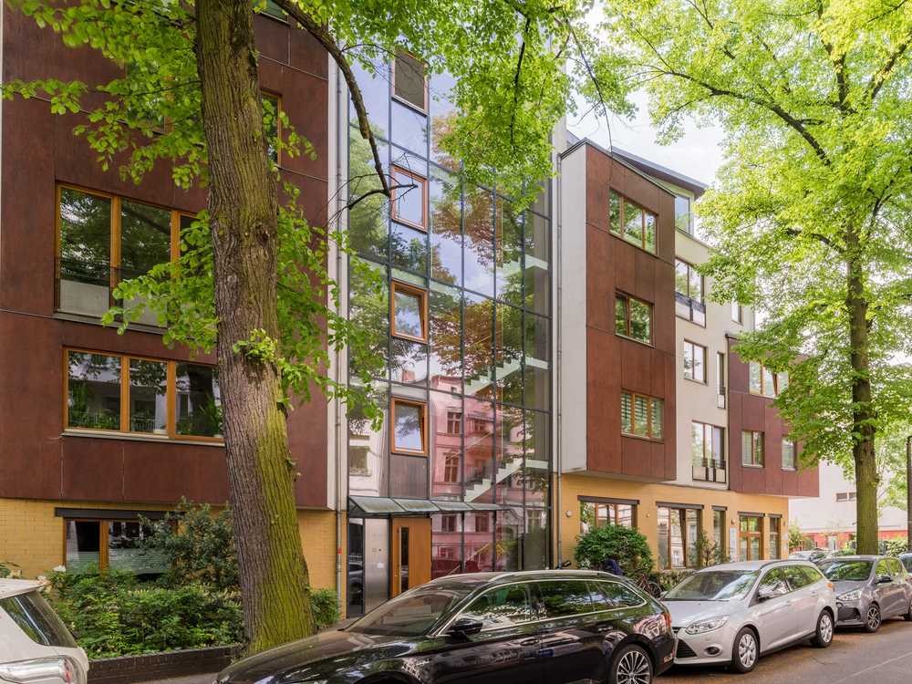 Die Fassade mit großzügig verglastem Treppenhausbereich und unterschiedlichen Bauteilelementen unterstreicht den besonderen Charakter des Objektes. Es verfügt über 4 Vollgeschosse und ein Dachgeschoss und ist voll unterkellert.