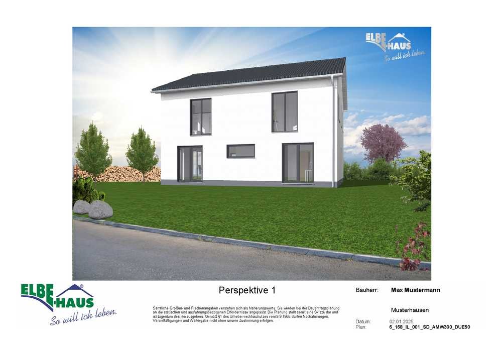 Dieses innovative Elbe-Haus® wird in massiver Bauweise von qualifiziertem Fachpersonal errichtet. Wir planen und projektieren nach Ihren Vorstellungen und Wünschen und somit ist wirklich jedes Haus einzigartig. Beachten Sie bitte, dass das abgebildete Haus lediglich ein Bebauungsbeispiel ist. Das Grundstück kann unter Berücksichtigung der örtlichen Bauvorschriften mit Ihrem Wunschhaus von Elbe-Haus® errichtet werden.