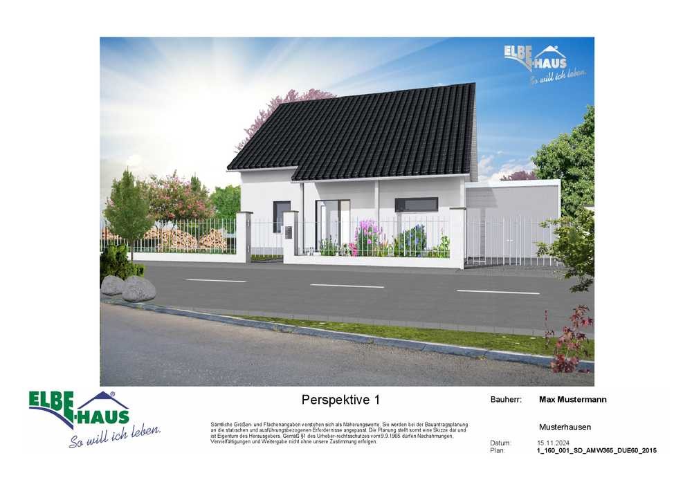 Dieses innovative Elbe-Haus® wird in massiver Bauweise von qualifiziertem Fachpersonal errichtet. Wir planen und projektieren nach Ihren Vorstellungen und Wünschen und somit ist wirklich jedes Haus einzigartig. Beachten Sie bitte, dass das abgebildete Haus lediglich ein Bebauungsbeispiel ist. Das Grundstück kann unter Berücksichtigung der örtlichen Bauvorschriften mit Ihrem Wunschhaus von Elbe-Haus® errichtet werden.
