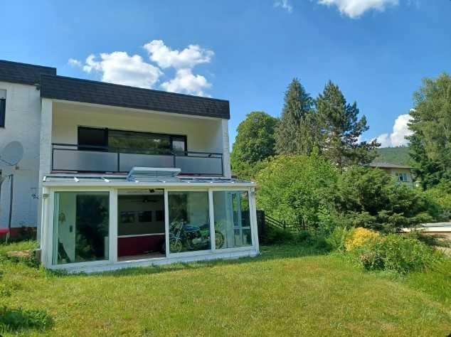 Vom Wohnzimmer aus gelangt man auf die Loggia, von der aus man einen herrlichen Blick auf den angrenzenden Wald hat.