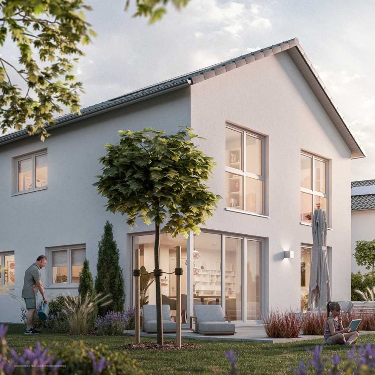 Bei diesem typisierten Familienhaus mit einer Wohnfläche von 105 m² wurde auf eine kostenintensive Unterkellerung verzichtet, dennoch bieten Abstellräume und der ausbaubare Dachraum ausreichend Staufläche.