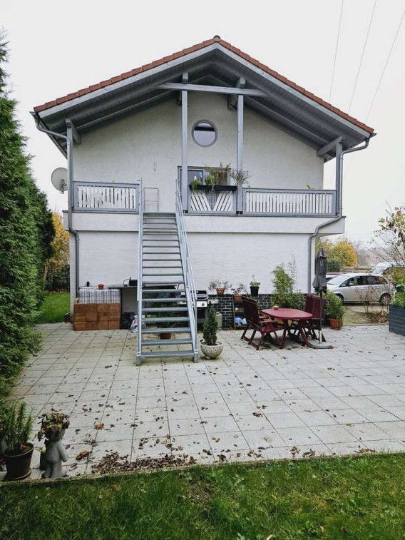 Zur Wohnung gehört ein großer Balkon, von diesem führt eine Stahltreppe auf eine darunterliegende Terrasse, welche ebenfalls zur Wohnung gehört.