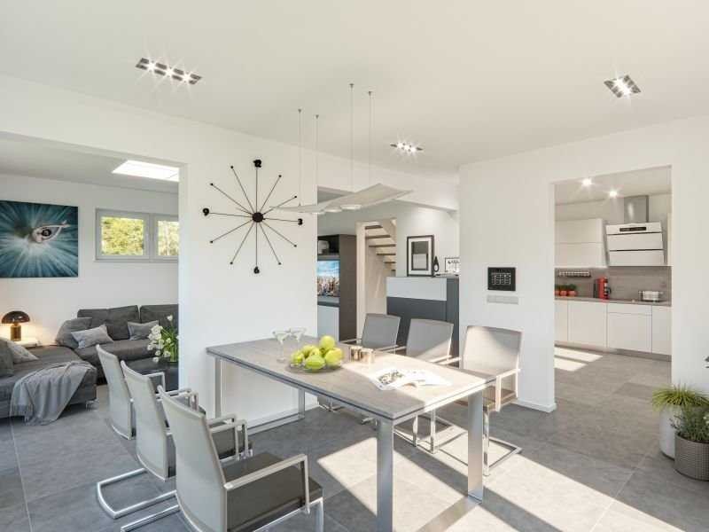Besonderes Highlight ist im Erdgeschoss das Wohn- und Esszimmer, welches sich über die gesamte Hausbreite erstreckt und direkt an die Küche anschließt.