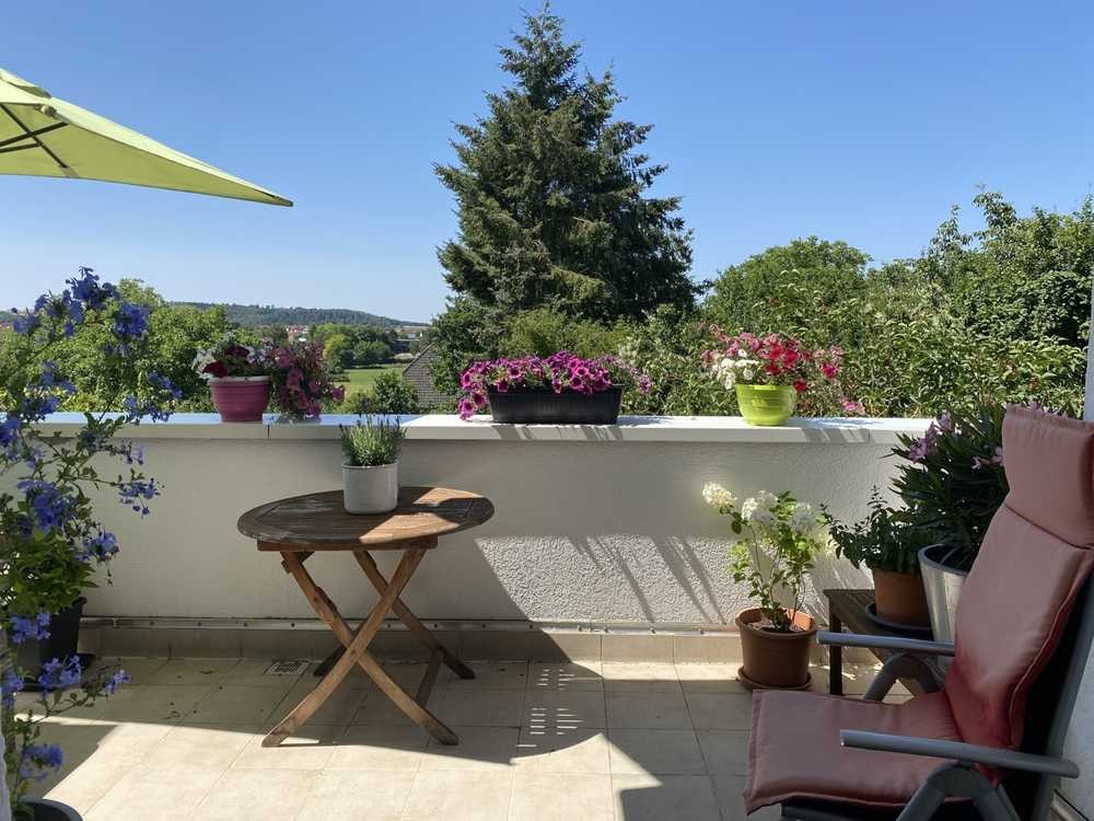 Ein weiterer Wohlfühlort ist das zweite Wohn-/Schlafzimmer auf der ersten Zwischenebene unter dem Erdgeschoss. An dieses schließt sich ein großer, schöner Balkon mit gemauerter Brüstung an, auf der sich der Feierabend mit Weitblick ins Grüne wunderbar genießen lässt. Ebenfalls auf dieser Etage befindet sich noch ein Arbeitszimmer.
