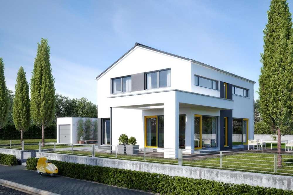 Vom überdachten Eingangsbereich gelangt man in die schnörkellos gestaltete, helle Diele mit geradläufiger Treppe. Der gesamte Grundrissgestaltung ist geprägt von Luftigkeit und Transparenz, wobei besonders die bodentiefe Verglasung in allen Wohnräumen für eine entspannte Wohnatmosphäre sorgt. Die gelben Glastüren setzen einen markanten farbige Akzent in der Fassade und verbinden alle Wohnräume des Erdgeschosses mit dem Garten und der überdachten Terrasse. Der großzügige Wohnraum geht fließend in den Essbereich über. Optisch getrennt, aber dennoch offen schließt sich der moderne Kochbereich an. Direkt daneben befindet sich der Hausanschluss- bzw. Abstellraum. Ein Duschbad mit bodengleicher Dusche ist im Dielenbereich vorgesehen.