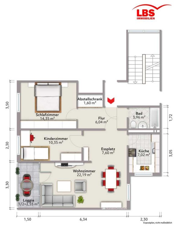 Außerdem verfügt die Immobilie über eine kleine Loggia (ca. 5 m²) die in sonniger Süd-West Lage ausgerichtet ist. Durch die nach außen angebrachten elektrischen Rollläden ist diese Loggia vielseitig nutzbar und für Kinder oder Haustiere gut geschützt.