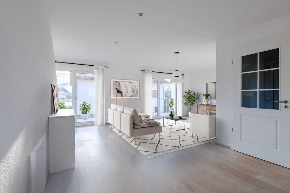 Sonniges Wohnen in dieser modernen Maisonette-Wohnung mit einer Wohnfläche von ca. 88 m² erleben. Das Objekt wurde 2014 in solider Massivbauweise errichtet und präsentiert sich in einem gepflegten Zustand. Über zwei Etagen (1. Obergeschoss mit Treppe vom eigenen Hauseingang erreichbar sowie Dachgeschoss, ebenfalls über eine Innentreppe erreichbar) erstrecken sich drei Zimmer: ein Wohn-/, Koch- und Essbereich, zwei Schlafzimmer sowie ein Tageslicht-Badezimmer mit Dusche und Badewanne. Ein praktisches, separates Gäste-WC ist ebenfalls vorhanden. Die Räumlichkeiten sind sehr hell und freundlich gestaltet und bieten viel Platz für individuelle Wohnträume. Im großzügigen Wohn-/, Koch- und Essbereich strahlt durch die bodentiefe Verglasung nach Süden viel Tageslicht ein. Die moderne offene Küchenecke mit Esstheke lässt sich auch gut um einen gemütlichen Essplatz ergänzen. Eine überdachte Loggia auf der gesamten Breite der Wohnung lädt mit Bergblick nach Südost und Südwest ein. Über eine gemauerte Innentreppe erschließt sich das Dachgeschoss mit Badezimmer und zwei Schlafzimmer auf gegenüberliegenden Seiten. Große Dachflächenfenster sorgen auch hier für sehr viel Lichteinfall. In den Dachschrägen lassen sich individuelle Aufbewahrungsmöbel gut integrieren. Für Schlafzimmerschränke bieten sich die hohen Innenwände an. Im Dachgeschoss sind unter den Dachschrägen begehbare Speicher eingebaut, welche als Nutzfläche und Abstellräume genutzt werden können. Das Haus hat keinen Keller und keine Kellerabteile. Zur Verfügung stehen zwei nicht überdachte Außenstellplätze direkt vor dem Hauseingang, welche exklusiv zur Wohnung gehören. Ein Garten gehört nicht zum Objekt, jedoch bieten die umliegenden Grünflächen ausreichend Möglichkeiten für Erholung und Freizeitgestaltung.