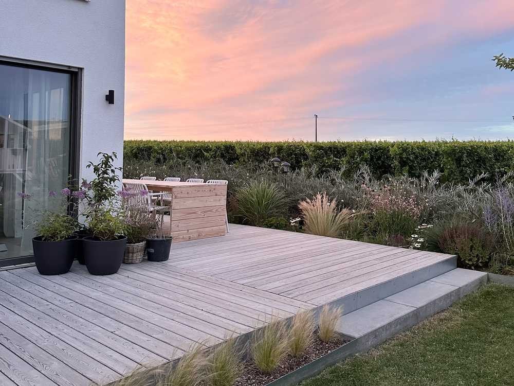 Aus dem lichtdurchfluteten Wohnbereich und der großzügigen Küche mit Blick auf die Weinreben, gelangt man direkt auf die große Holzterrasse, die sich über zwei Hausseiten erstreckt.