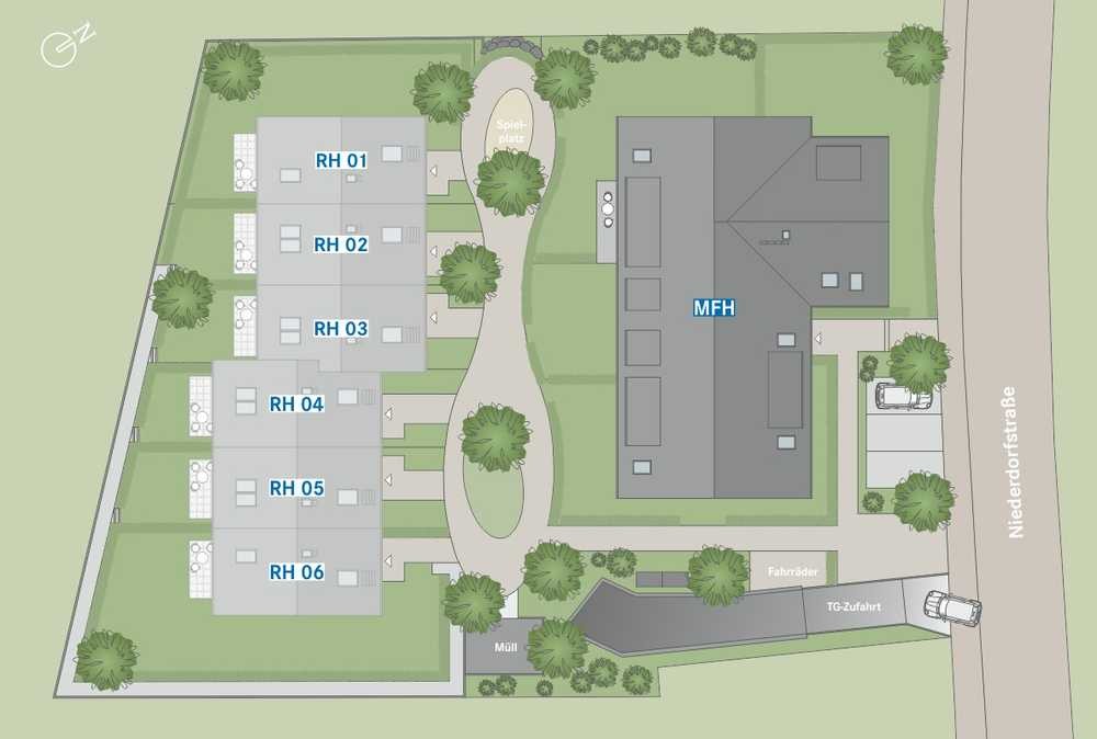 In der Ortsmitte von Ehrenkirchen entstehen in gelungener Anordnung insgesamt ein Mehrfamilienhaus und sechs Reihenhäuser. Eine geschickt geplante Wegeführung, die lockere Bebauung und die Verlegung der Pkw-Stellplätze in die übersichtlich aufgeteilte Tiefgarage, sorgen für ein ruhiges und ungestörtes Wohngefühl.