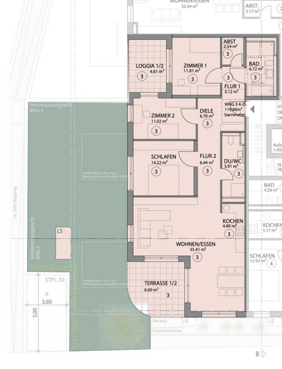 Es entstehen zwei Wohngebäude mit 12 und 9 Wohneinheiten. Jede Wohnung verfügt über einen privaten Garten, eine überdachte Loggia oder eine traumhafte Dachterrasse – charmant und lebensbereichernd. Die ansprechende Architektur gipfelt in begrünten Fassaden und Pergolen. Moderne Schiebeläden dienen der Verschattung und gestalten die Fassade spielerisch durch deren flexible Positionierung.