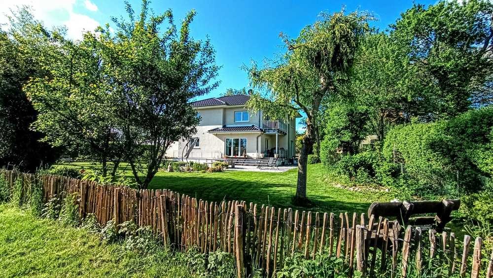 Über eine mit neuester Schließtechnik ausgestatteten Haustüre gelangen Sie in das Erdgeschoss des Hauses, hier befindet sich der große Wohn-, Koch- und Essbereich sowie eine geräumige Gästetoilette. Die großen Fensterfronten verleihen dem Wohn- und Essbereich eine luftige und helle Atmosphäre. Angrenzend zur Küche befindet sich eine geräumige Speisekammer. Durch die Entfernung der Wand ließe sich die Küche problemlos vergrößern. Vom Keller bis zum Obergeschoss befindet sich neben der Treppe ein Abstellraum, der mit einem Aufzug ausgestattet werden könnte. Die Geschosse werden mit einer formschönen Echtholztreppe verbunden. Im Obergeschoss befinden sich die beiden Schlafzimmer und ein Arbeitszimmer sowie das große Badezimmer mit begehbarer Dusche, zwei Waschbecken und einer Sauna. Anstelle der Sauna könnte aber auch eine Badewanne installiert werden, da die Anschlüsse dafür bereits vorhanden sind. Im Kellergeschoss wurde der Technikraum mit Waschmaschinenanschluss, ein Gästezimmer und eine separate Einliegerwohnung mit Einbauküche und Badezimmer untergebracht. Die Einliegerwohnung kann über eine Außentreppe und eine eigene Eingangstüre erreicht werden. Das Haus ist in den Wohnräumen mit wunderschönen Fliesen in Holzoptik ausgestattet. Eingangsbereich und Gästetoilette erhielten hochwertige Natursteinfliesen. Die beiden Badezimmer im Obergeschoss und in der Einliegerwohnung wurden modern in den Farben Weiß und Anthrazit gefliest. Alle Etagen sind mit einer zeitgemäßen Fußbodenheizung ausgestattet, die über zwei moderne Luft-Wärmepumpen gespeist wird. Hier haben wir die Besonderheit, dass das Heizsystem auf Wärmen und bei Bedarf auf Kühlen umgestellt werden kann. In den dreifachverglasten Fenstern wurde eine Zwangsbelüftung verbaut. Im Keller des Hauses ist eine Entkalkungsanlage installiert. Die nach Süden ausgerichtete Terrasse bietet einen entspannenden Blick auf den schön angelegten Garten und den Gartenteich. Die äußerst praktische Gartenbewässerung wird über eine Zisterne versorgt. Ein schöner Jacuzzi - perfekt für den Wellnessurlaub zu Hause- sowie eine praktische Gartenhütte zum Abstellen von Geräten und Fahrrädern runden den Außenbereich perfekt ab.