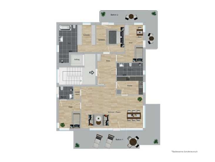 Durch die beiden Balkone (mit je 50 % in die Nutzfläche eingerechnet) können Sie die Aussicht genießen und Ihre Freizeit im Freien verbringen.