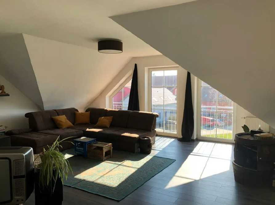 Räumlichkeiten. Das Wohnzimmer mit Essbereich imponiert mit einer Größe von ca. 50 m². Trotz Dachschrägen haben Sie zu keiner Zeit das Gefühl in einem eingeengten Raum zu wohnen. Auch ein Balkon ist vorhanden, der über das Schlafzimmer zu erreichen ist. Im Bad erwartet Sie eine bodentiefe Dusche und moderne Fliesen. Die gesamte Wohnung ist mit hochwertigen Fliesen & Böden verbaut.