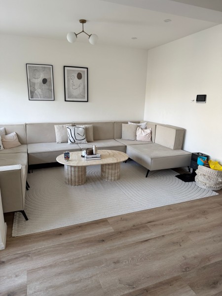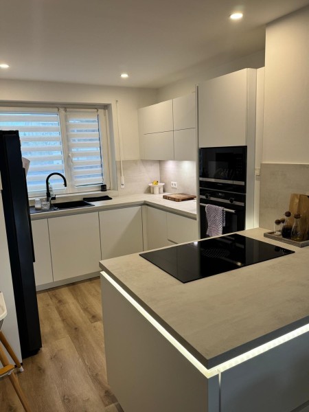 Die moderne Einbauküche lässt keine Wünsche offen: Ein Quooker-Wasserhahn liefert kochendes Wasser auf Knopfdruck, während das Bora-Kochfeld mit integriertem Dunstabzug für ein angenehmes Kocherlebnis sorgt. Zudem sind hochwertige Markengeräte wie Mikrowelle, Backofen und Spülmaschine verbaut. Eine stilvolle Unterbeleuchtung sorgt für ein gemütliches Ambiente.