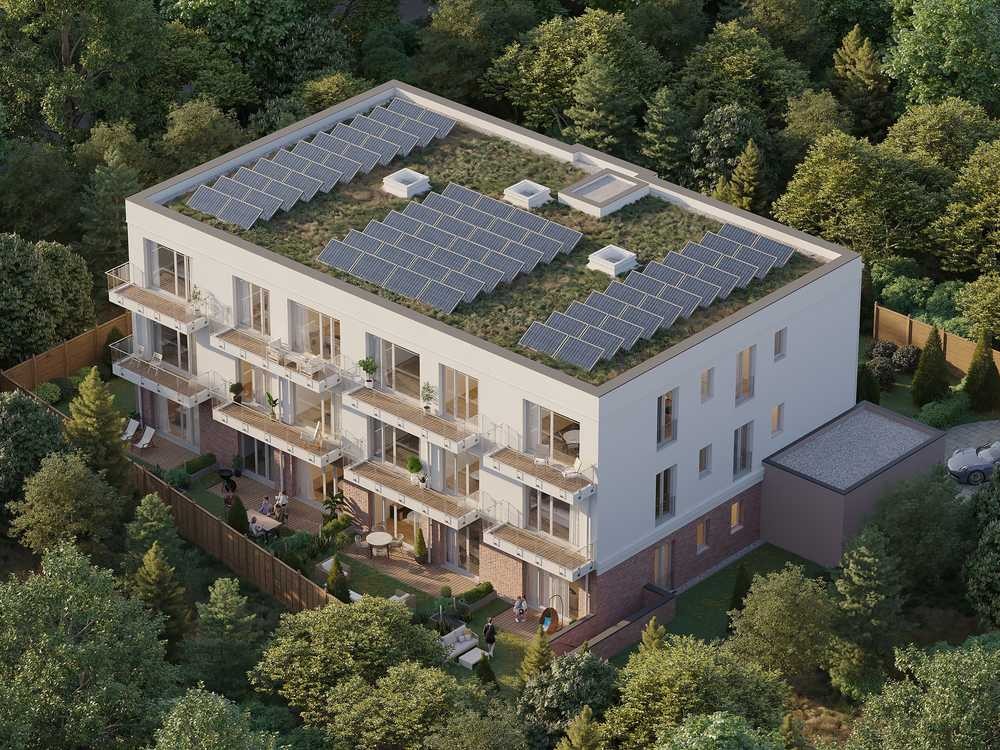 In der idyllischen Gemeinde Hoppegarten unweit der Galopprennbahn entsteht mit der Rennbahnallee 103 ein exklusives Wohnensemble mit 12 hochwertigen Eigentumswohnungen. Das moderne dreigeschossige Mehrfamilienhaus beeindruckt durch seine durchdachte Architektur und die harmonische Integration in die grüne Umgebung. Besonders angenehm ist die Lage in zweiter Reihe, die für zusätzliche Ruhe und Privatsphäre sorgt – weit weg vom Straßenlärm, aber dennoch perfekt angebunden. Die großzügigen Verglasungen und die Südwest-Ausrichtung garantieren lichtdurchflutete Räume und ein angenehmes Wohnambiente. Das nachhaltige Gebäude wird nach dem zukunftssicheren KfW-55 EE Standard errichtet und verfügt über eine eigene Photovoltaikanlage. Diese Kombination aus hochwertiger Immobilie und niedrigen Energiekosten macht das Objekt ideal für anspruchsvolle Eigennutzer oder für Kapitalanleger, die auf Wertstabilität und Nachhaltigkeit setzen.