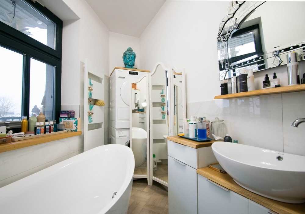 Die Wohnung ist mit einem modernen Badezimmer ausgestattet, das über eine freistehende Badewanne verfügt. Hochwertige Bodenbeläge unterstreichen das gepflegte Wohnambiente.