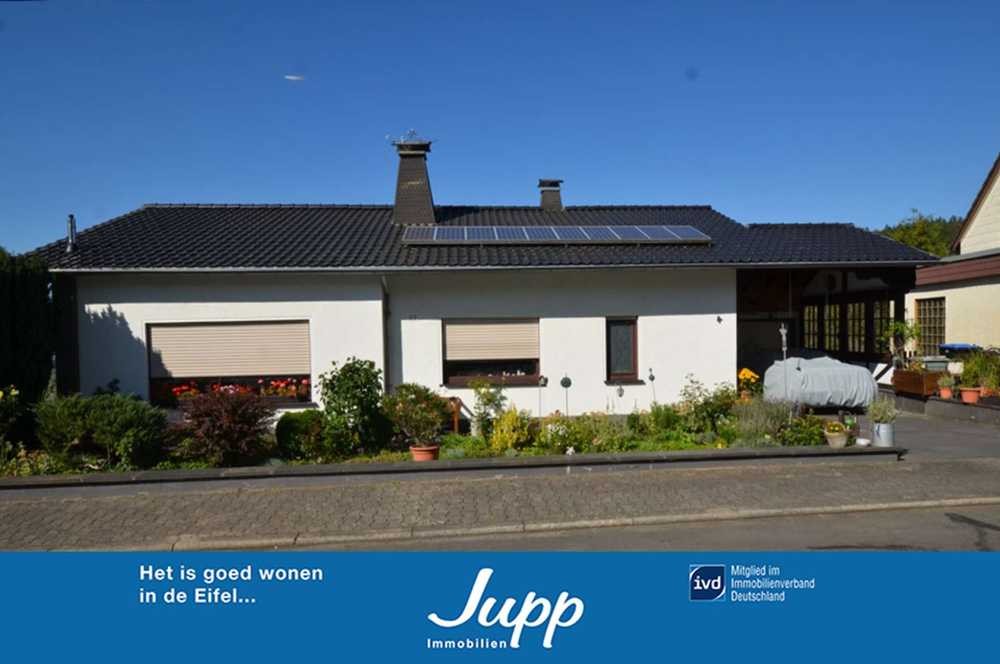 Dieses schöne EFH mit ELW wurde 1965 in Massivbauweise errichtet und steht in wunderbarer Höhenlage in einer ruhigen Wohnstraße ohne Durchgangsverkehr oberhalb den Dächern von Jünkerath. Vom Garten, Terrasse und Balkon aus hat man einen schönen Blick über das Obere Kylltal.