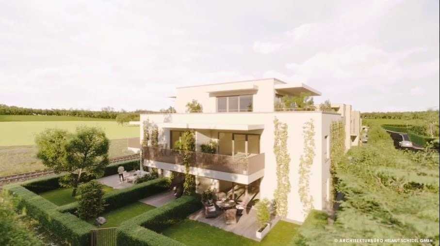 Die gesamte Wohnanlage ist nach Südwesten ausgerichtet und Sie können einen unverbaubaren Blick ins Grüne genießen. Die Wohnungen im Erdgeschoss verfügen über große Terrassen mit Gartenanteil, im Obergeschoss sind überdachte Balkone vorhanden und im Dachgeschoss großzügige Dachterrassen. Die Außenanlagen werden ansprechend gestaltet, insbesondere in der Bahnhofstraße entsteht durch eine durchgängige Baumneupflanzung ein Alleecharakter.
