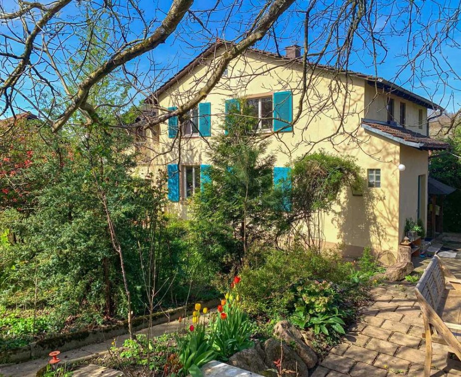 Auch der Außenbereich ist ein echtes Highlight: Türkisfarbene Fensterläden verleihen der Fassade eine mediterrane Note, während üppiges Grün und malerische Kletterpflanzen wie Glyzinien und Klettertrompeten Hauswand und Balkone schmücken. Ein südländischer Traum, der sich auch im liebevoll angelegten Garten fortsetzt – mit duftenden Blumen, Kräutern und Plätzen, die zum Verweilen einladen.