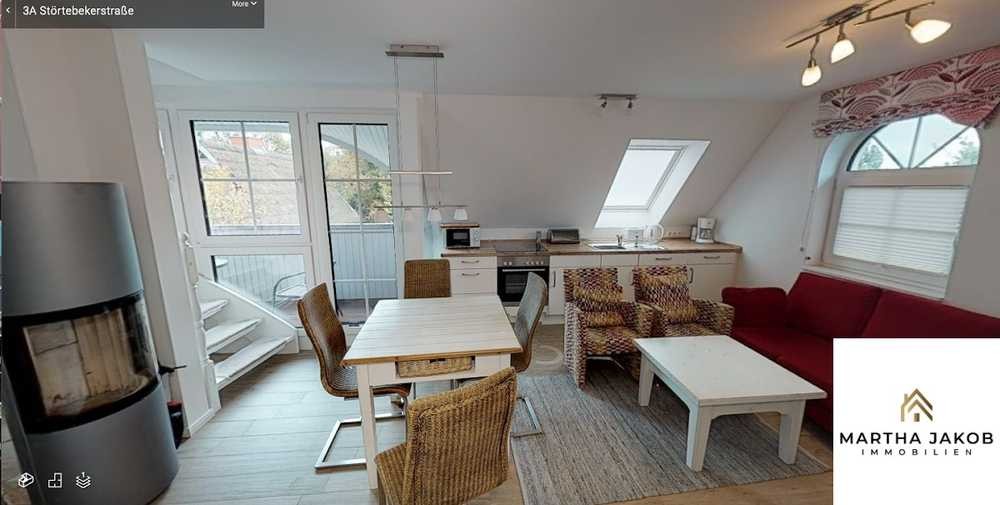 Die Südwest- und Südost-Ausrichtung der Wohnung sorgt für eine lichtdurchflutete Atmosphäre und einen herrlichen Blick auf die umliegenden Reetdachhäuser und den grünen Baumbestand des Martha-Müller-Grählert-Kurparks. Die sonnige Loggia ist der perfekte Ort, um den Urlaub zu genießen und die warmen Sommerabende in vollen Zügen zu erleben.