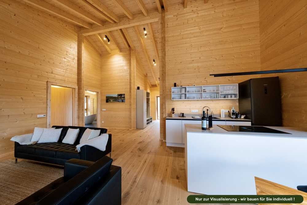 Das hier beispielhaft gezeigte 125 m2 Bungalow-Chalet ist mit unserem 36 cm starken zweischaligen NETTEN-Blockbohlensystem erbaut. Im Ergebnis erreichen wir den KFW 40 Energieeffizienzstandard und Sie haben auf Wunsch den Anspruch auf die maximale staatliche Bauförderung. Unsere Innenwände sind mit 12 cm oder 14 cm starken Massivholzbohlen aufgebaut. Ebenfalls in unserem Qualitätsstandard enthalten sind sichtbare Dach- und Deckensparren, bodentiefe 2,25 m hohe Fenster und eine Deckenhöhe von mind. 2,6 Meter!