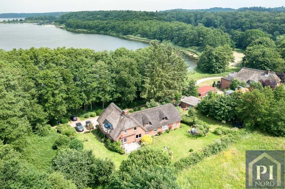 Umgeben von Natur liegt das Reetdachhaus mit drei Wohneinheiten.