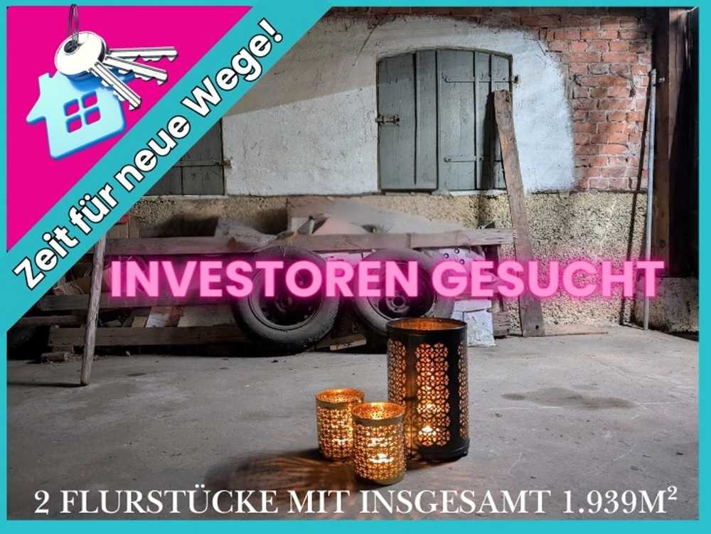 Zum Verkauf stehen zwei Grundstücke mit insgesamt 1.939m² Fläche. Auf dem kleineren der beiden Flurstücke mit einer Fläche von 513m² steht ein 1891 erbautes Zweifamilienhaus mit angebauter Scheune. Ein Gewölbekeller und ein ebenfalls angebauter, gemauerter Schuppen hinter dem Haus gehören dazu. Insgesamt ist das Gebäudeensemble in einem stark sanierungsbedürftigen Zustand, wobei der gelungene Grundriss und die insgesamt solide Bauweise durchaus das Abwägen zwischen Abriss mit anschließender Neubebauung und einer Kernsanierung rechtfertigen.