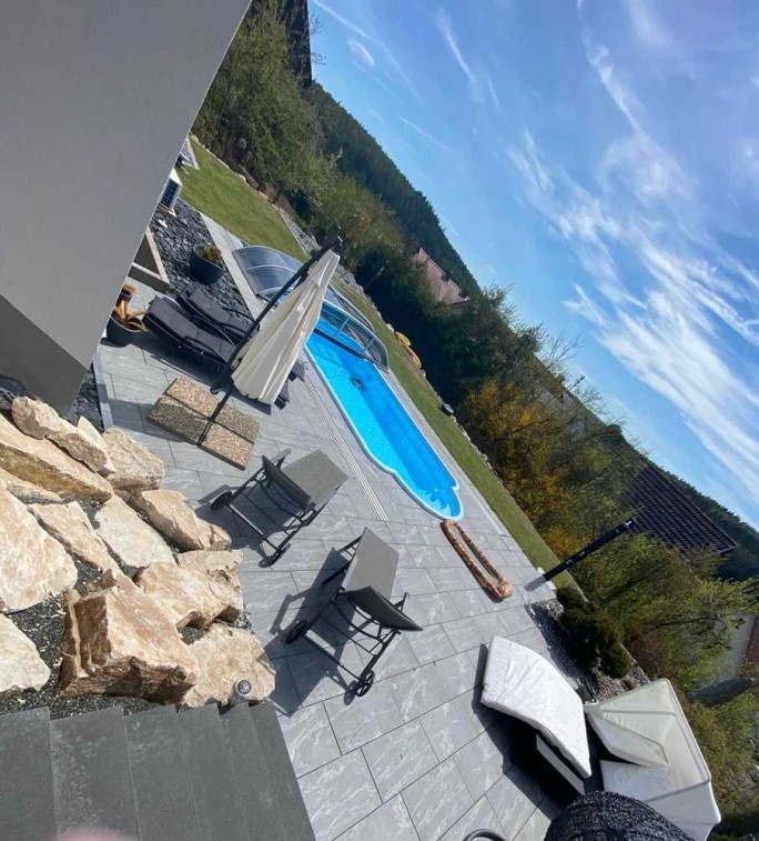 Auf dem 1.650 qm großen Hof finden Sie ein großzügiges Einfamilienhaus mit ca. 320 qm Wohnfläche auf drei Ebenen mit Außenpool und Liegefläche.