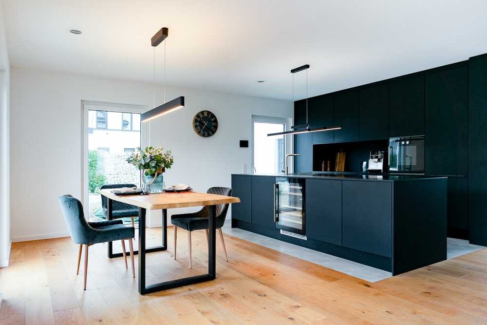 Die hochwertige Designküche mit Kochfeld samt integriertem Dunstabzug, Weinkühlschrank und modernen Einbaugeräten überzeugt mit Funktionalität und Eleganz. Die angrenzende Essecke vor bodentiefen Fenstern schafft eine helle, einladende Atmosphäre. Die gegenüberliegende Wohnlounge lädt zu gemütlichen Fernsehabenden ein. Über eine Smarthome Lösung lassen sich u.a. die Rolläden steuern.