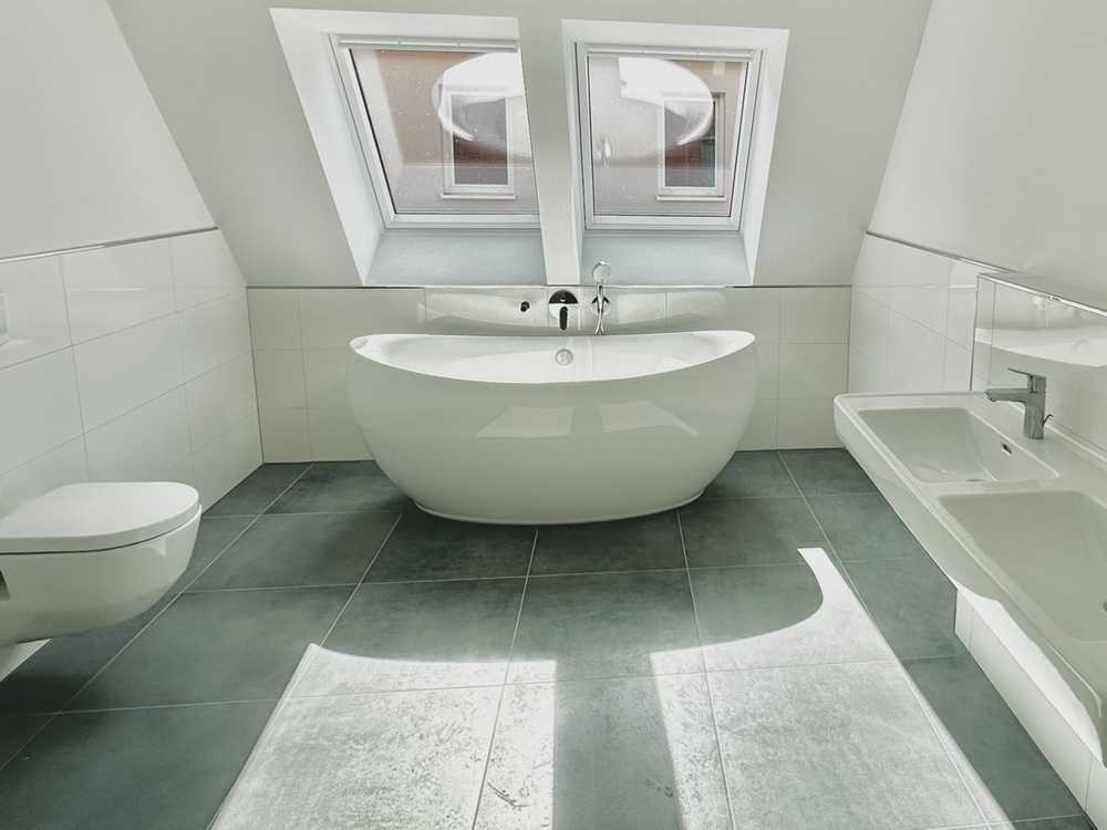 Das Badezimmer dieser Wohnung ist das wahre Highlight. Die freistehende Badewanne steht zentral im Raum und zieht sofort die Blicke auf sich. Zwei großzügige Dachfenster über der Badewanne erlauben einen atemberaubenden Blick in den Sternenhimmel und sorgen für ein besonders luxuriöses Badeerlebnis. Die Wandfliesen in edlem Weiß und die Bodenfliesen in modernem Grauton verleihen dem Raum eine exklusive Atmosphäre. Abgerundet wird das Badezimmer mit einer bodentiefen Dusche und zwei Waschbecken, die für höchsten Komfort sorgen.